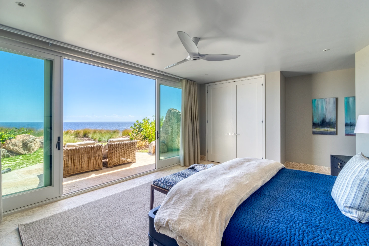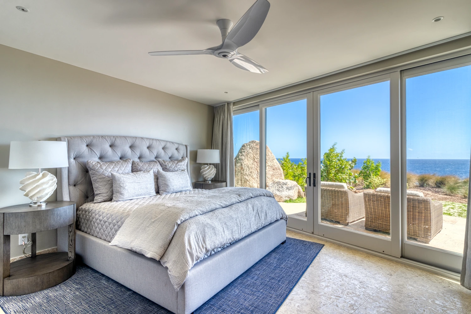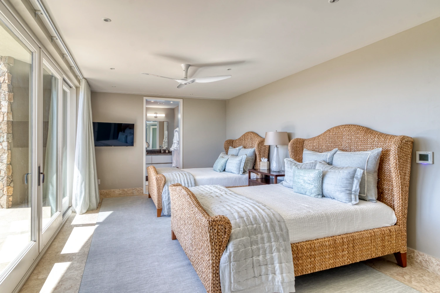 Halo Villa features 5 bedrooms, 5 en-suite bathrooms, and 2 half baths, accommodating up to 12 guests. Four bedrooms boast a king-size bed, and one bedroom includes two queen-size beds. Bedrooms offer TVs and access to private furnished terraces, where guests can sip a cup of morning coffee while taking in fresh sea air. Daily housekeeping and nightly turndown service are provided at the villa.