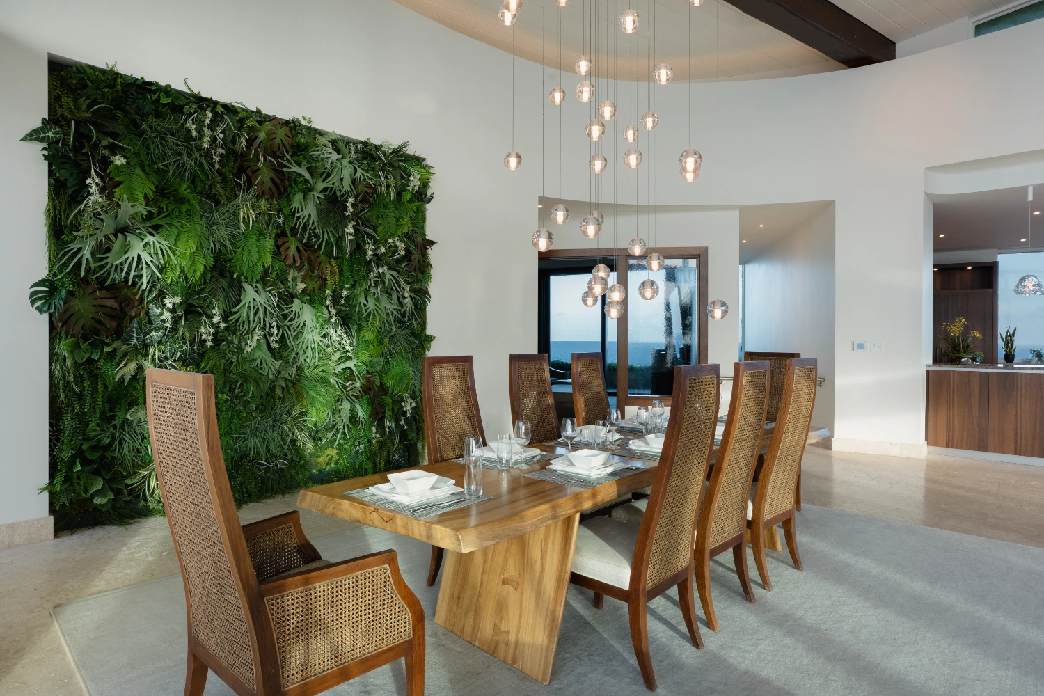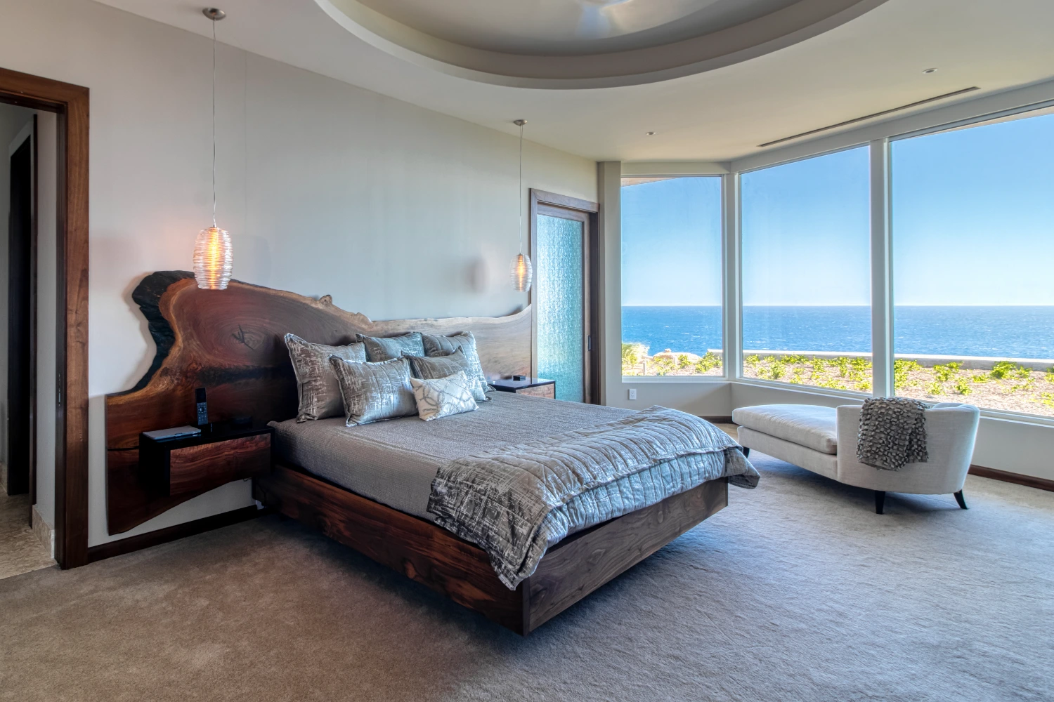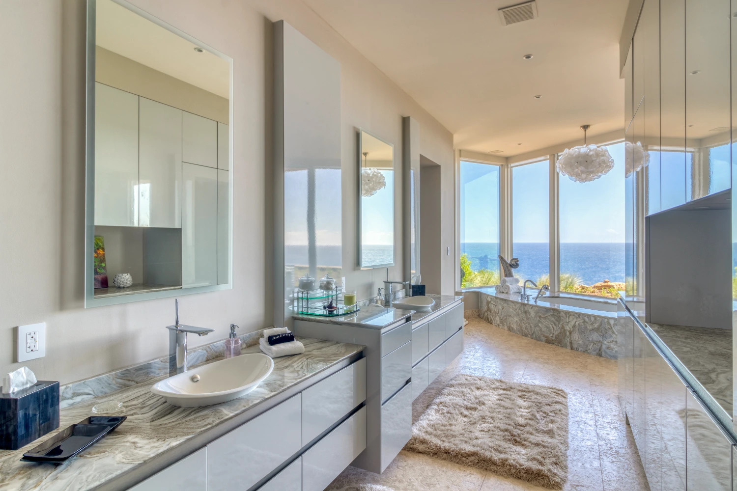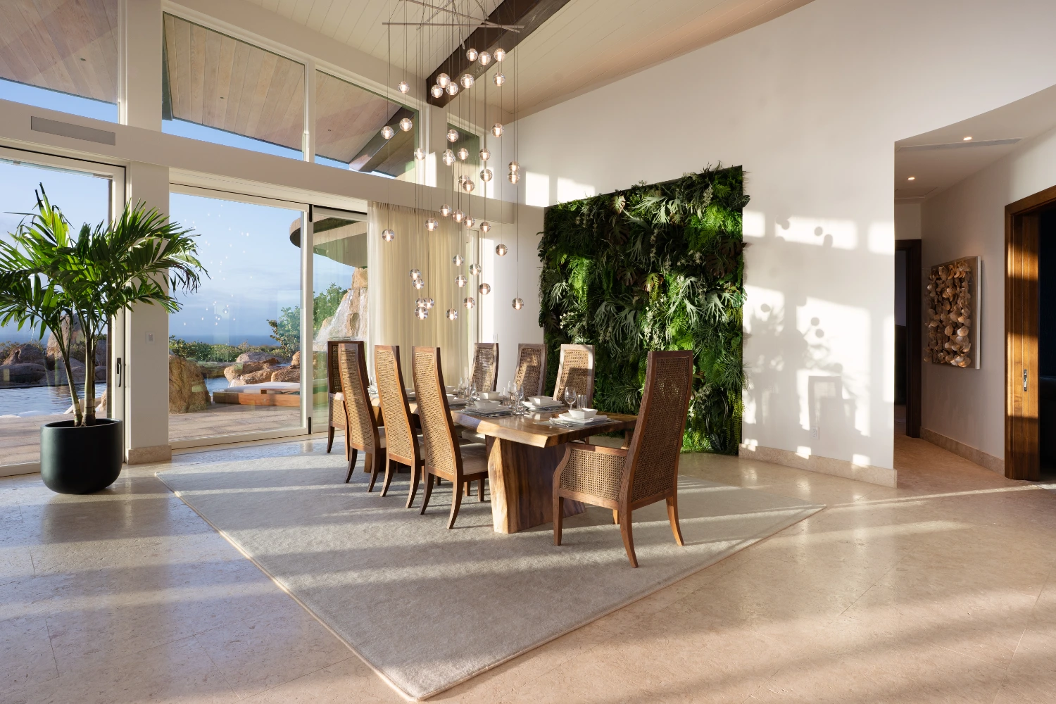 Halo Villa features 5 bedrooms, 5 en-suite bathrooms, and 2 half baths, accommodating up to 12 guests. Four bedrooms boast a king-size bed, and one bedroom includes two queen-size beds. Bedrooms offer TVs and access to private furnished terraces, where guests can sip a cup of morning coffee while taking in fresh sea air. Daily housekeeping and nightly turndown service are provided at the villa.