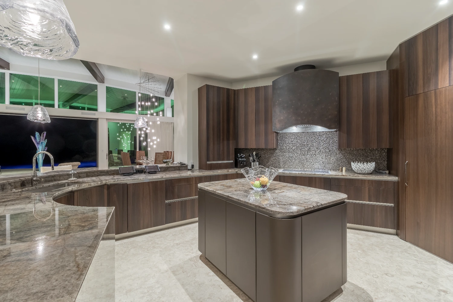 The sleek gourmet kitchen features a spacious marble island, a sophisticated circular bar with seating, and a built-in breakfast bar. Guests are welcome to dine al fresco on the terrace throughout their stay.