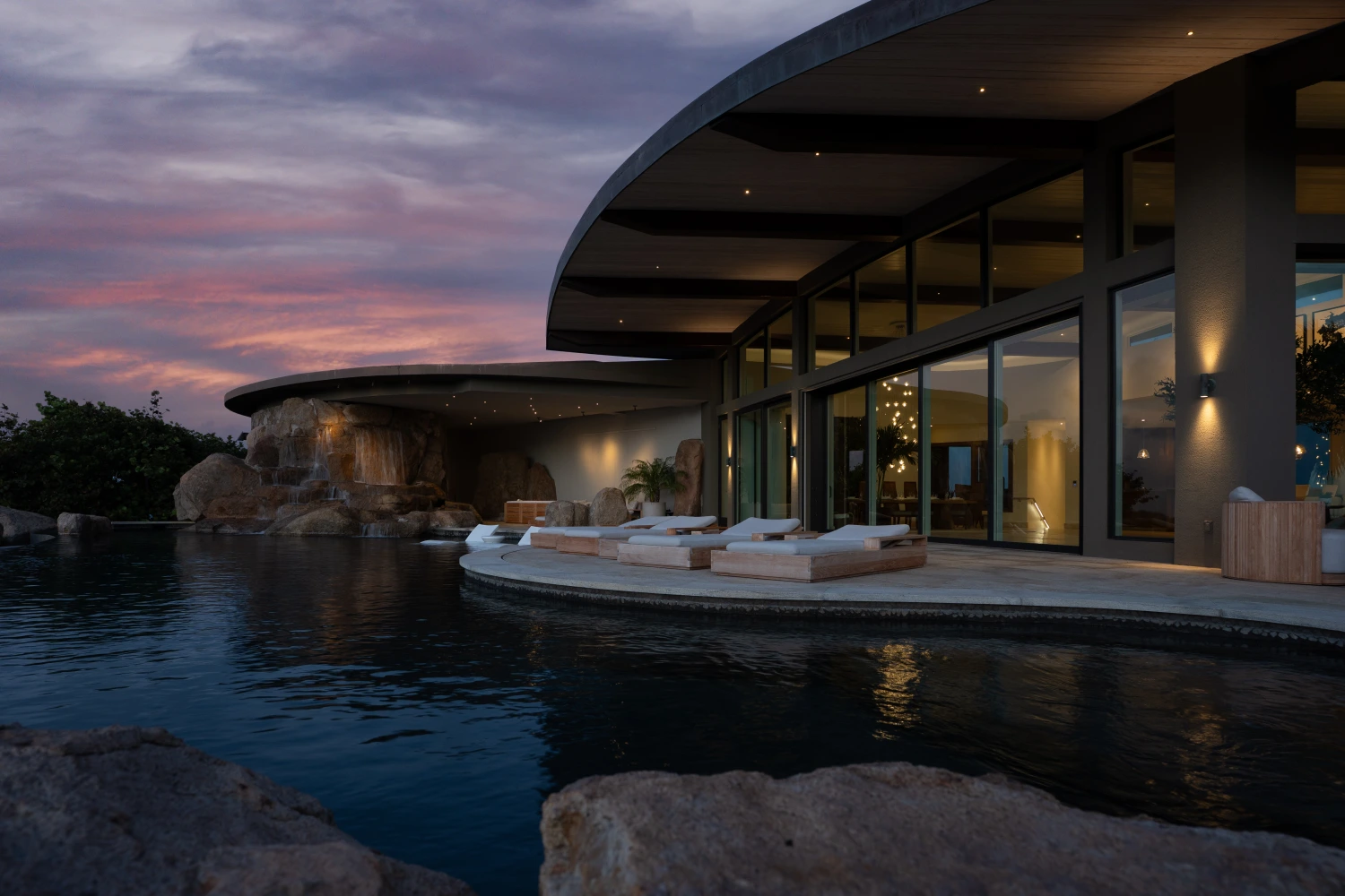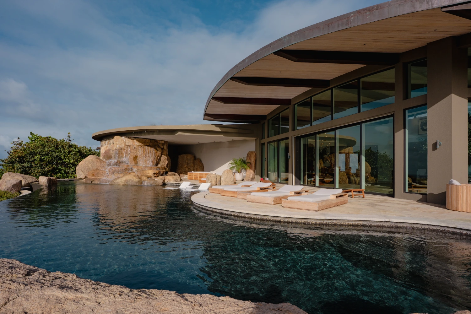 The free-form infinity pool is set off with greenery and a custom boulder waterfall, creating a unique outdoor area ideal for relaxation any time of day. Guests can recline poolside on sun loungers while enjoying the tranquility of Halo Villa.