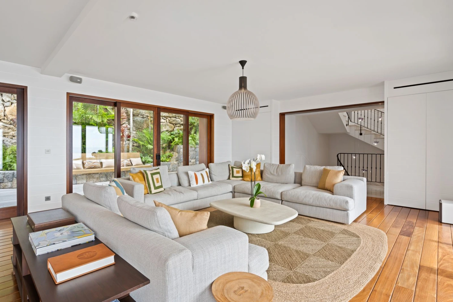 Take in a spectacular sunset on the water or retreat to the covered outdoor lounge for a cocktail. The rear of the villa boasts another terrace, complete with built-in seating and palm trees.